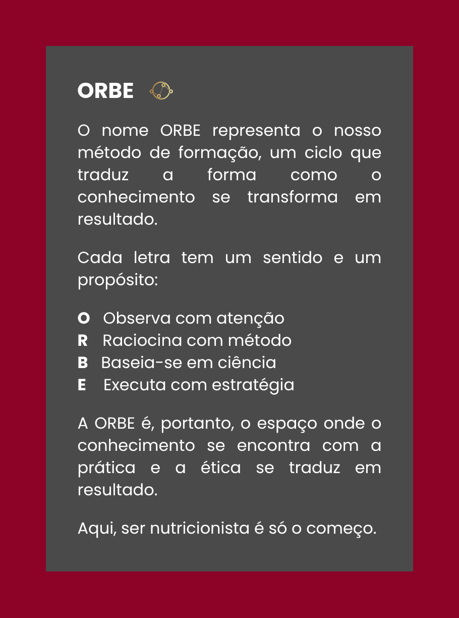 Mais do que uma marca, a ORBE é um espaço de pertencimento, um círculo que conecta quem leva a Nutrição a sério, quem busca excelência técnica e quem entende que o conhecimento só tem valor quando é aplicado.